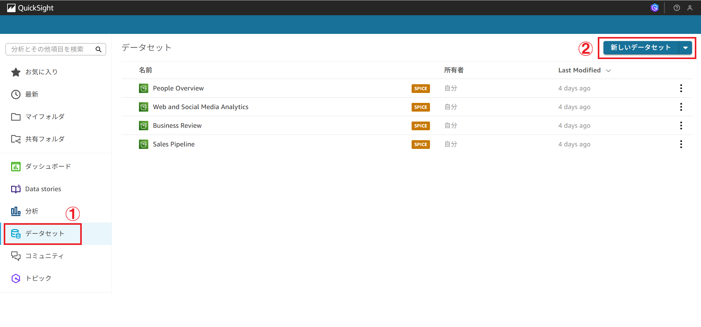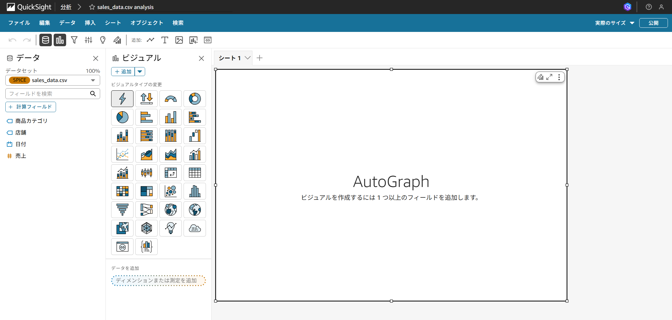 準備ができたら、いよいよQuickSightを操作していきましょう。