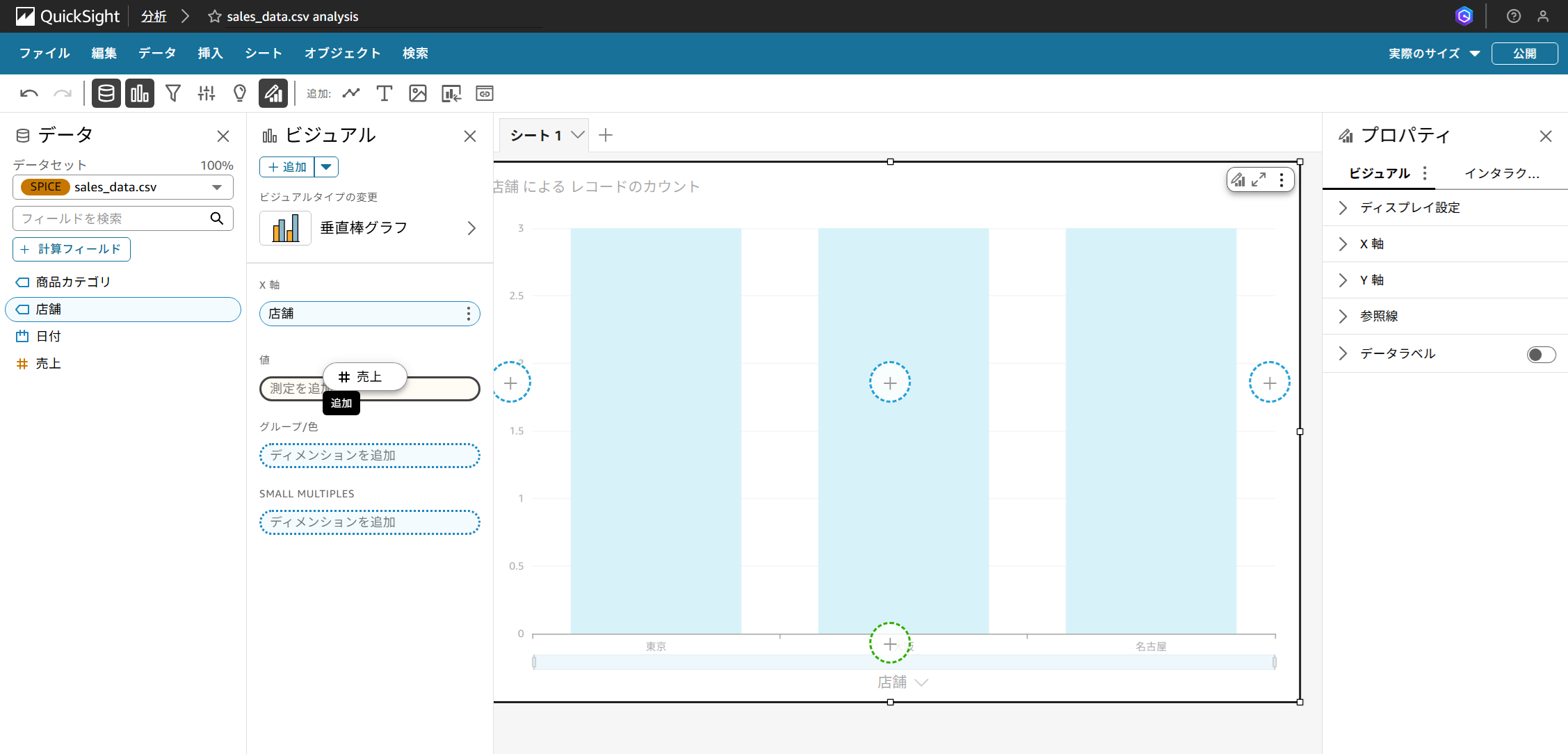 画面左上の「フィールドリスト」に、CSVの項目(日付、店舗など)が表示されています。ここから、「店舗」を「X軸」のボックスに、「売上」を「値」のボックスに、それぞれドラッグ&ドロップします。