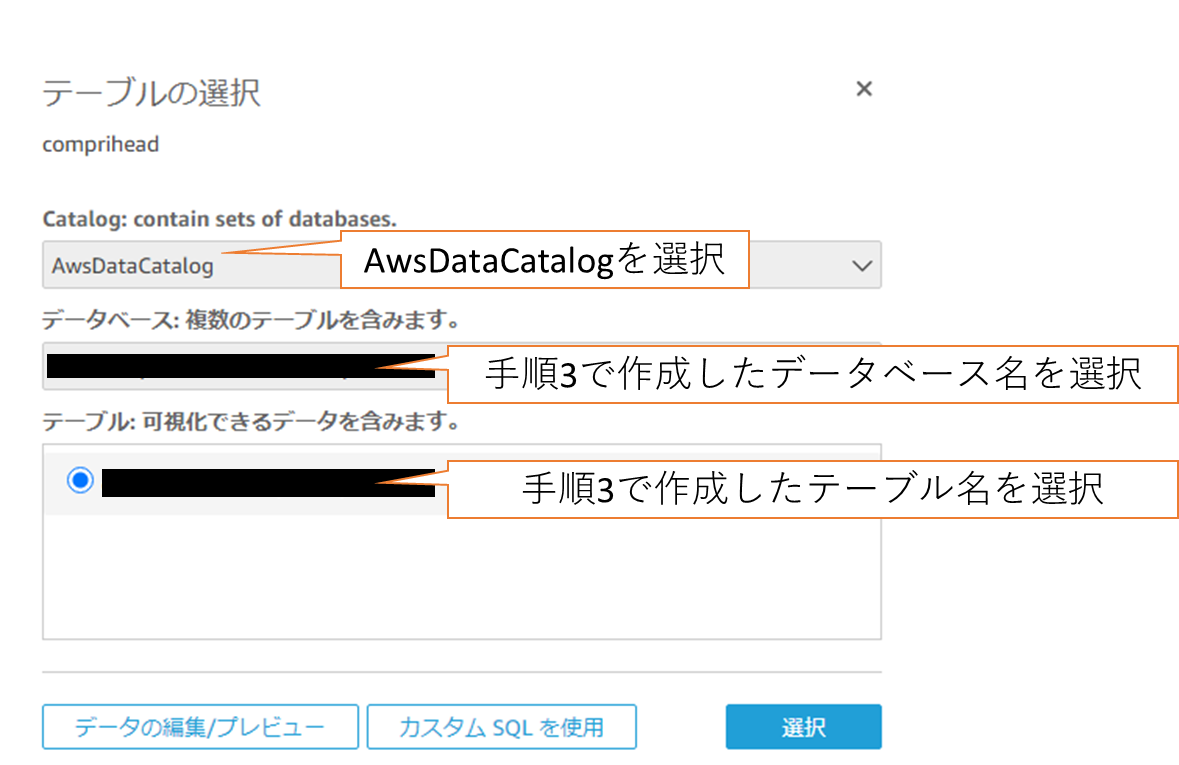 | データベース | 手順3「AWS Glueでカタログ化」で作成したデータベース名を選択します。 |