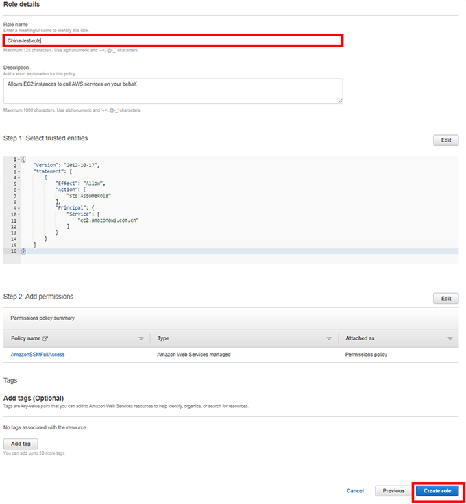Role detailsの画面が表示されます。Role nameに「China-test-Role」と入力して「Create Role」をクリックします。