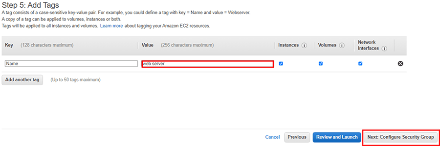 Valueにインスタンス名「web server」と入力し、その後「Next : Configure Security Group」をクリックします。