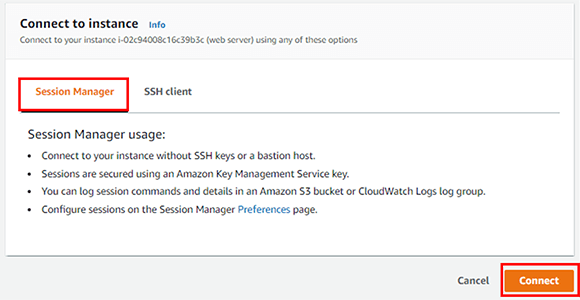 Connect to instanceの画面が表示されるので、「Session Manager」タブを選択し「Connect」をクリックします。