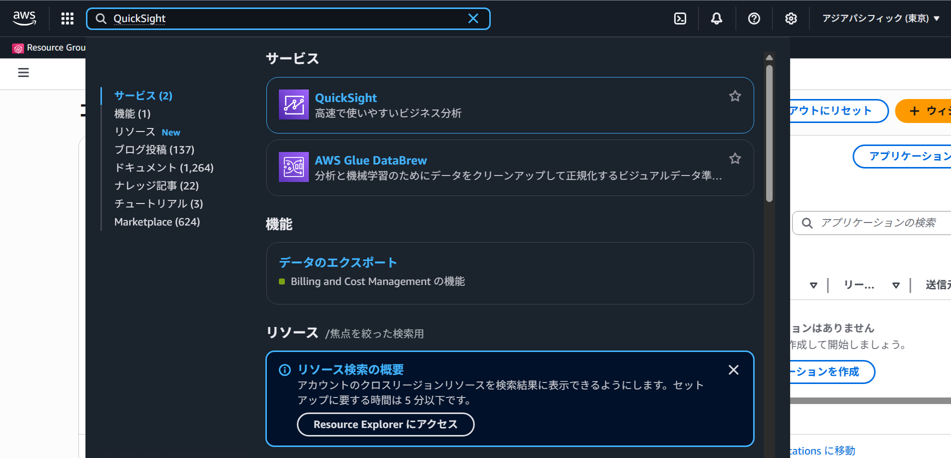 にログインし、上部の検索窓に「QuickSight」と入力して、サービスを選択します。