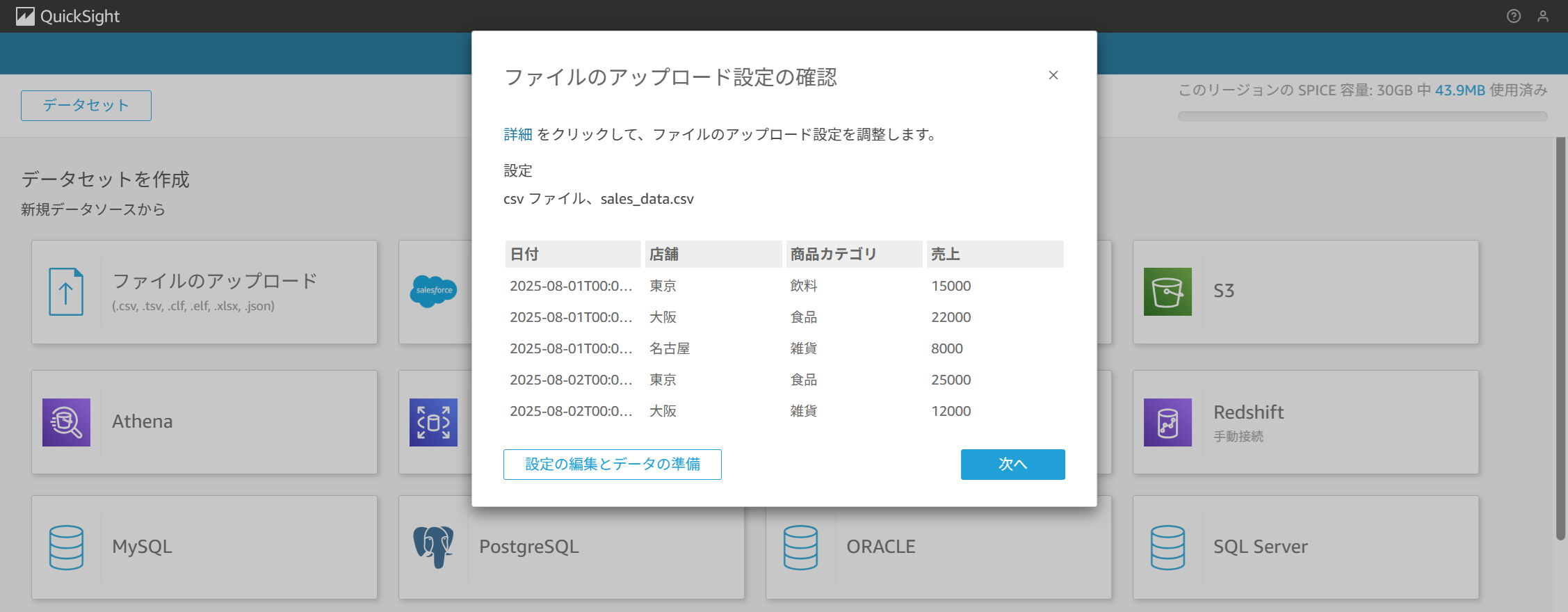 次に、先ほど用意したCSVファイルをQuickSightに読み込ませます。これを「データセットの作成」と呼びます。