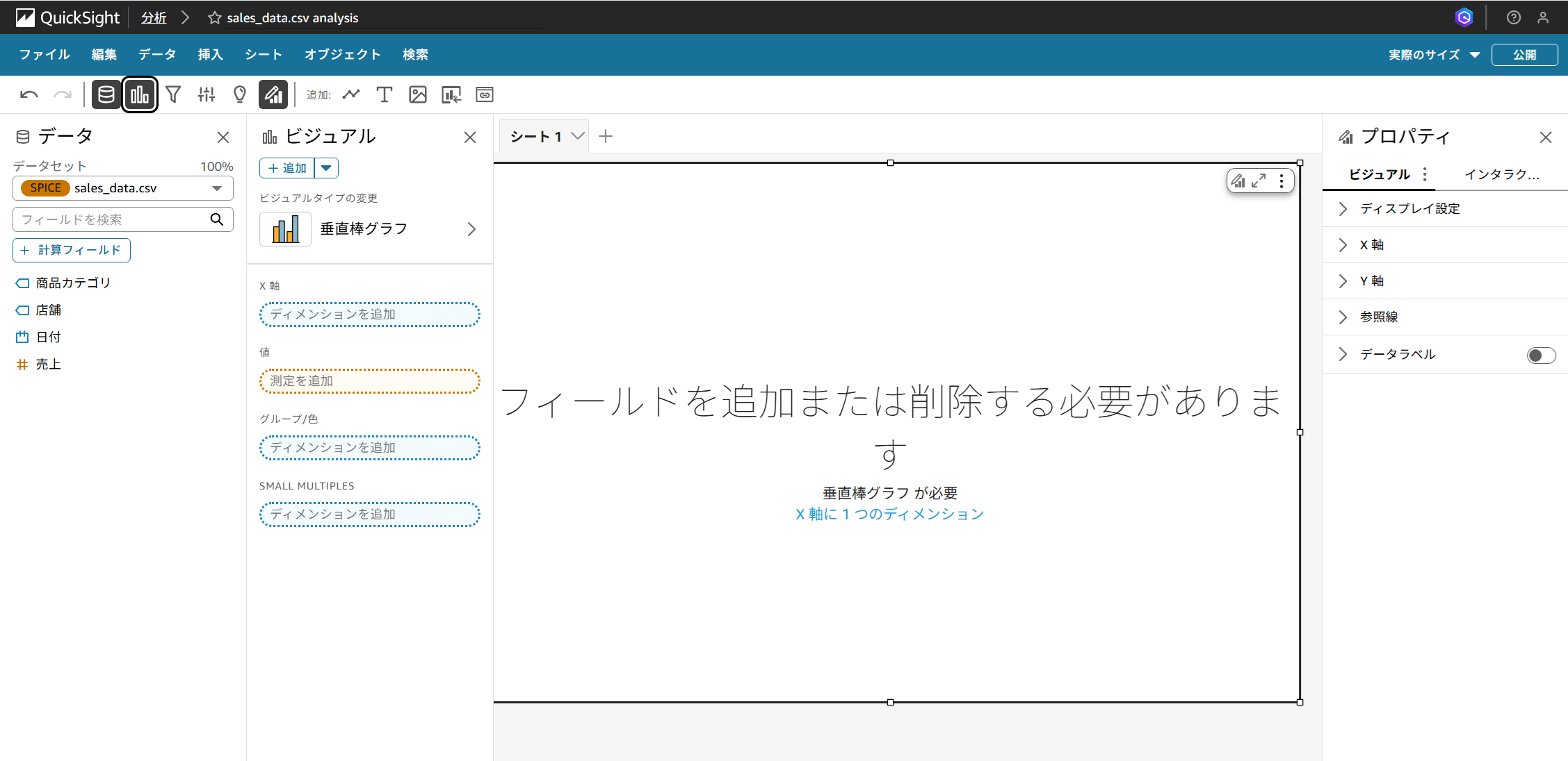 画面左上の「フィールドリスト」に、CSVの項目(日付、店舗など)が表示されています。ここから、「店舗」を「X軸」のボックスに、「売上」を「値」のボックスに、それぞれドラッグ&ドロップします。