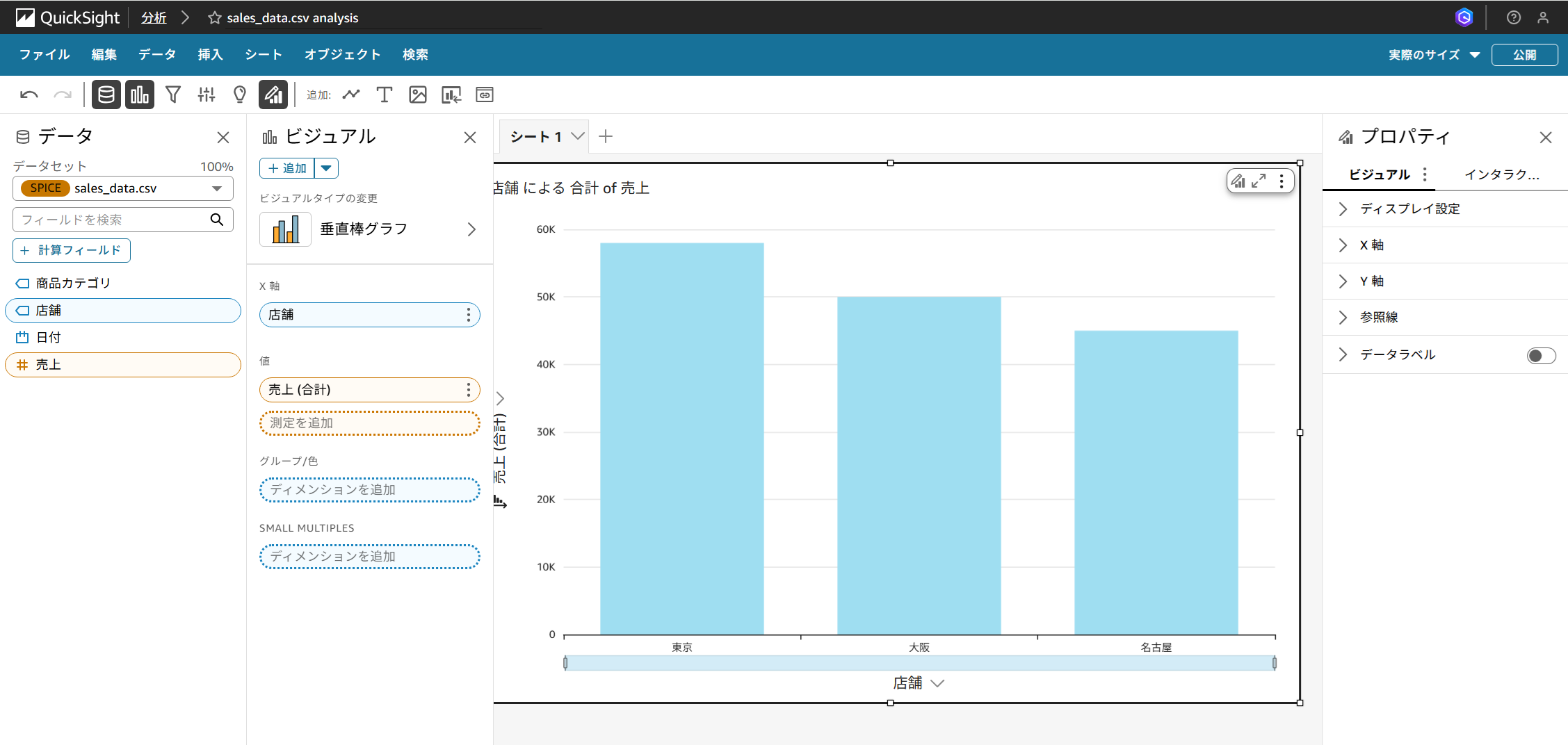 いよいよデータを可視化します。今回は「店舗ごとの売上合計」を示す棒グラフを作ってみましょう。