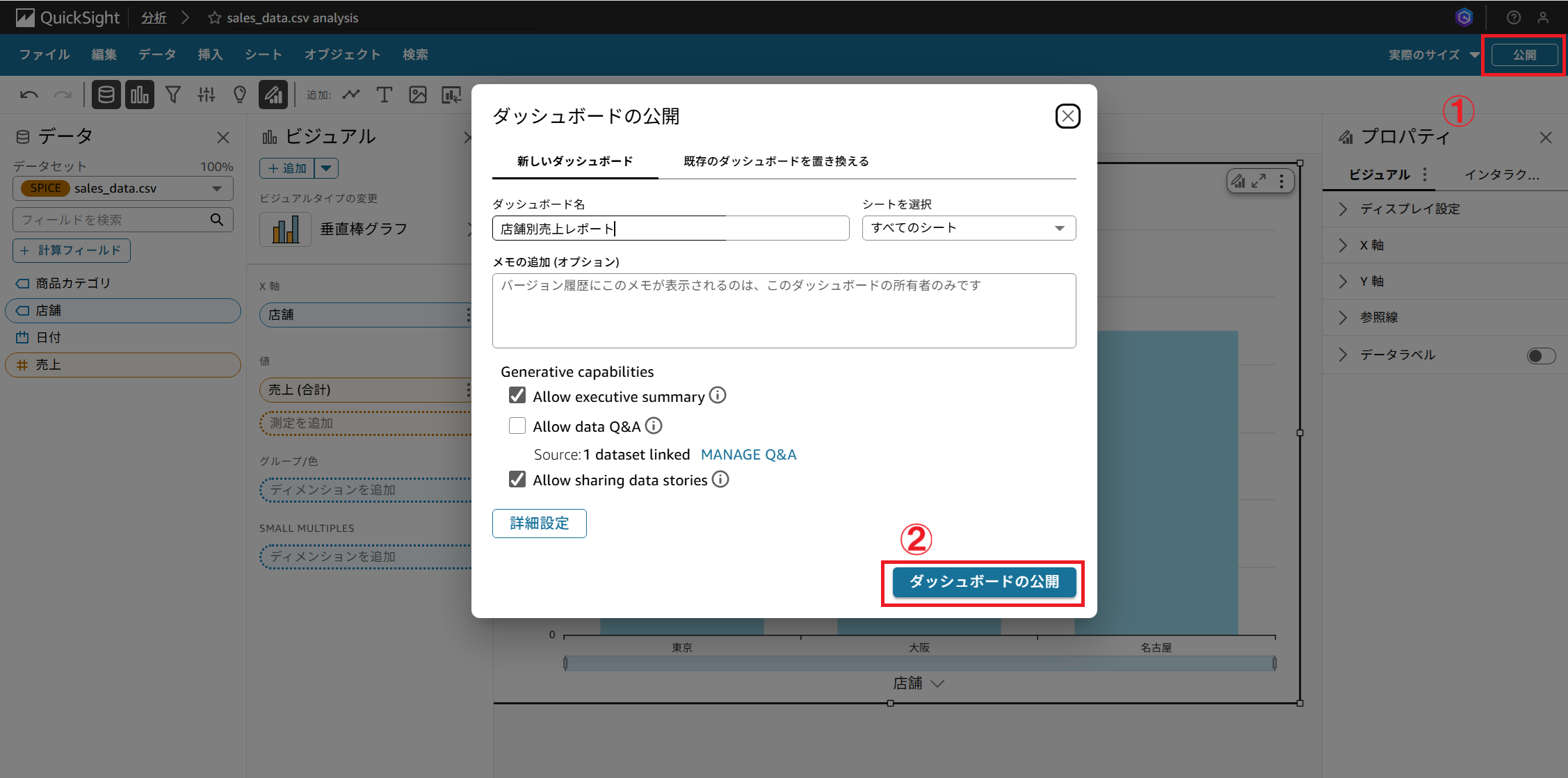 ダッシュボードに「店舗別売上レポート」などの名前を付けて、右下の「ダッシュボードを公開」ボタンをクリックします。