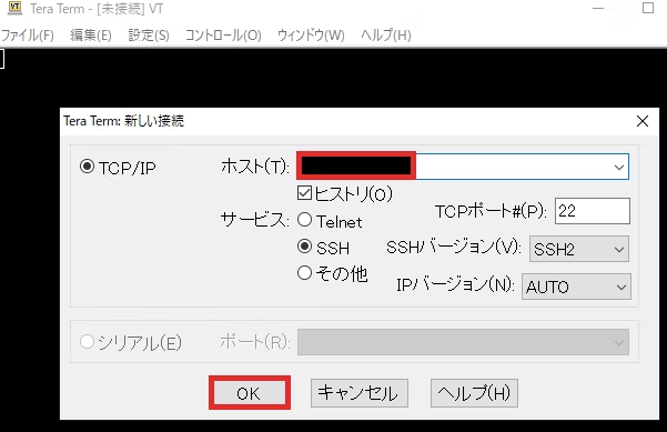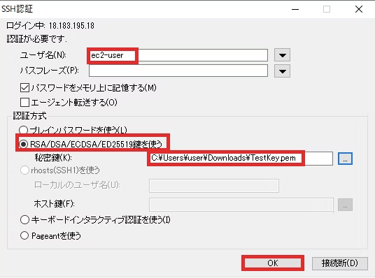 2.Teraterm 等の SSH クライアントで「ホスト名(パブリックIP)」および適切なユーザー名を入力し、変換済み鍵を読み込む設定を行う